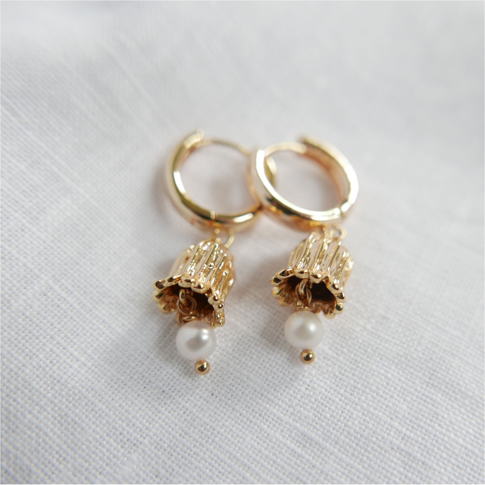 12k gold plated flora belle charms on gold plated lever back hoops with a small freshwater pearl bead.