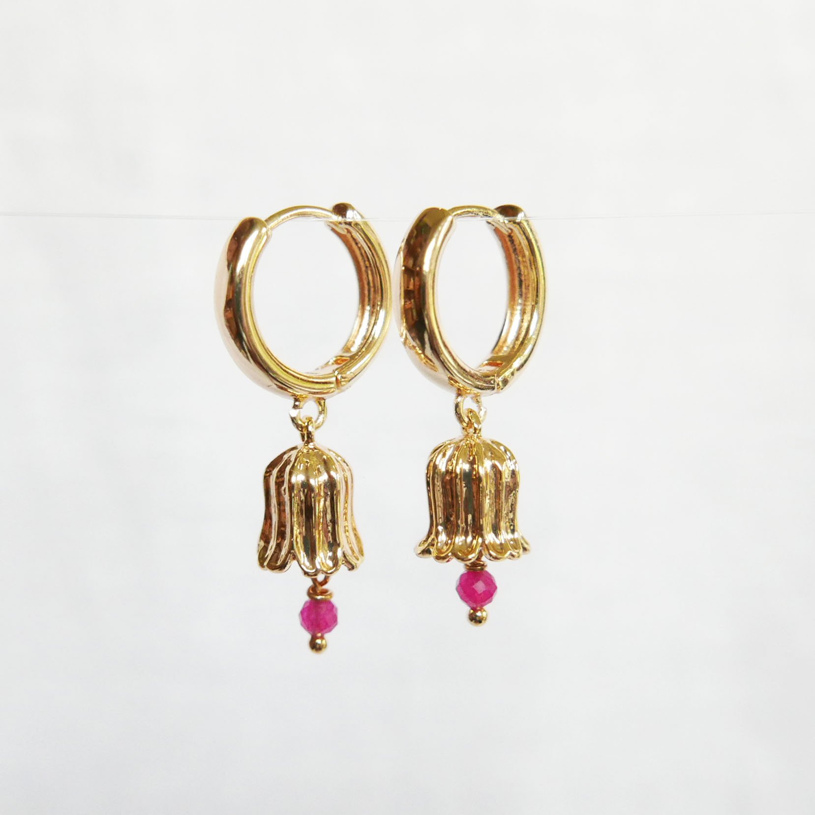12k gold plated flora belle charms on gold plated lever back hoops with a small pink tourmaline bead.