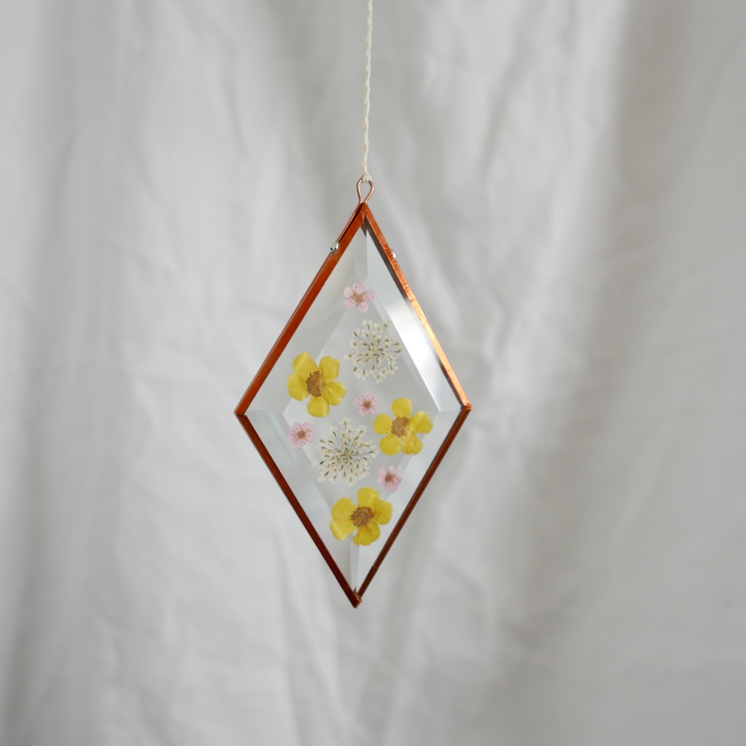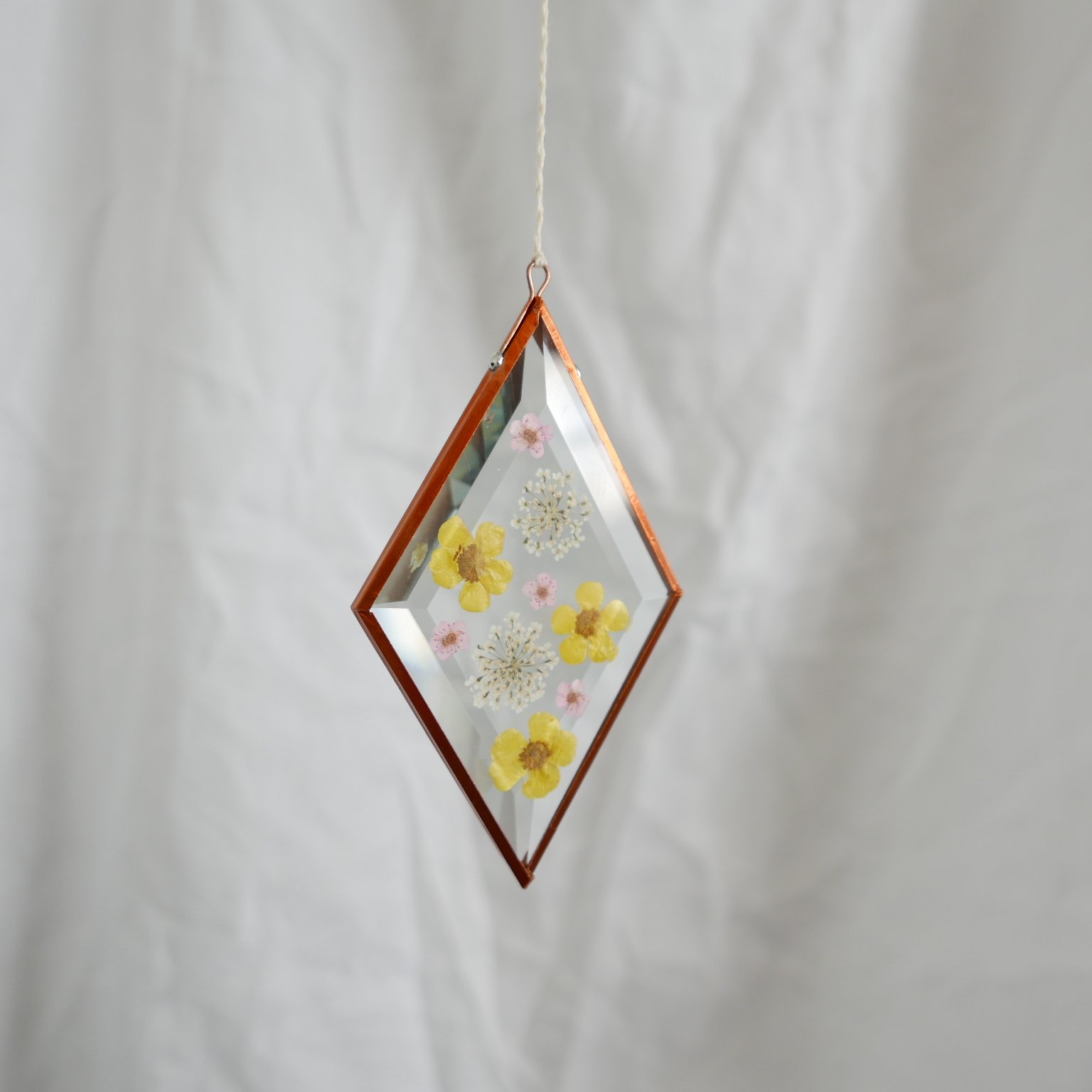 Delicate pressed flowers between glass with copper tape and hook on cotton thread.